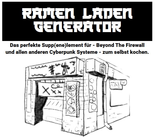 Diese Tabellen sind dafür da, einen Ramen Laden für eure Cyberpunk Welt zu erstellen. Macht es als Spielgruppe zusammen so habt ihr am meisten Spaß damit. Mit dabei sind auch Tabellen die euch helfen eine Ramen Portion für euch zu erstellen und so eurer Cyberpunk Welt mehr Geschmack zu geben.